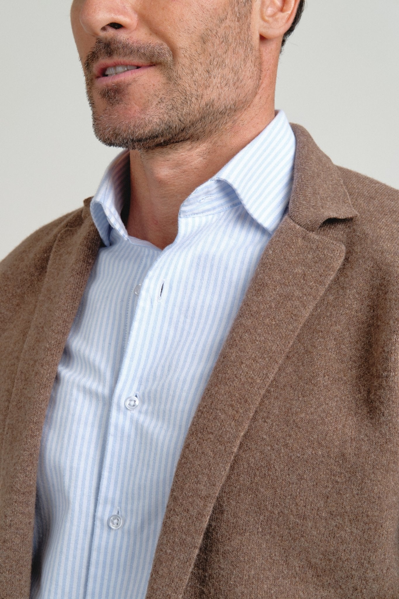 Los detalles de una chaqueta sastrera con la comodidad de un tejido de punto.