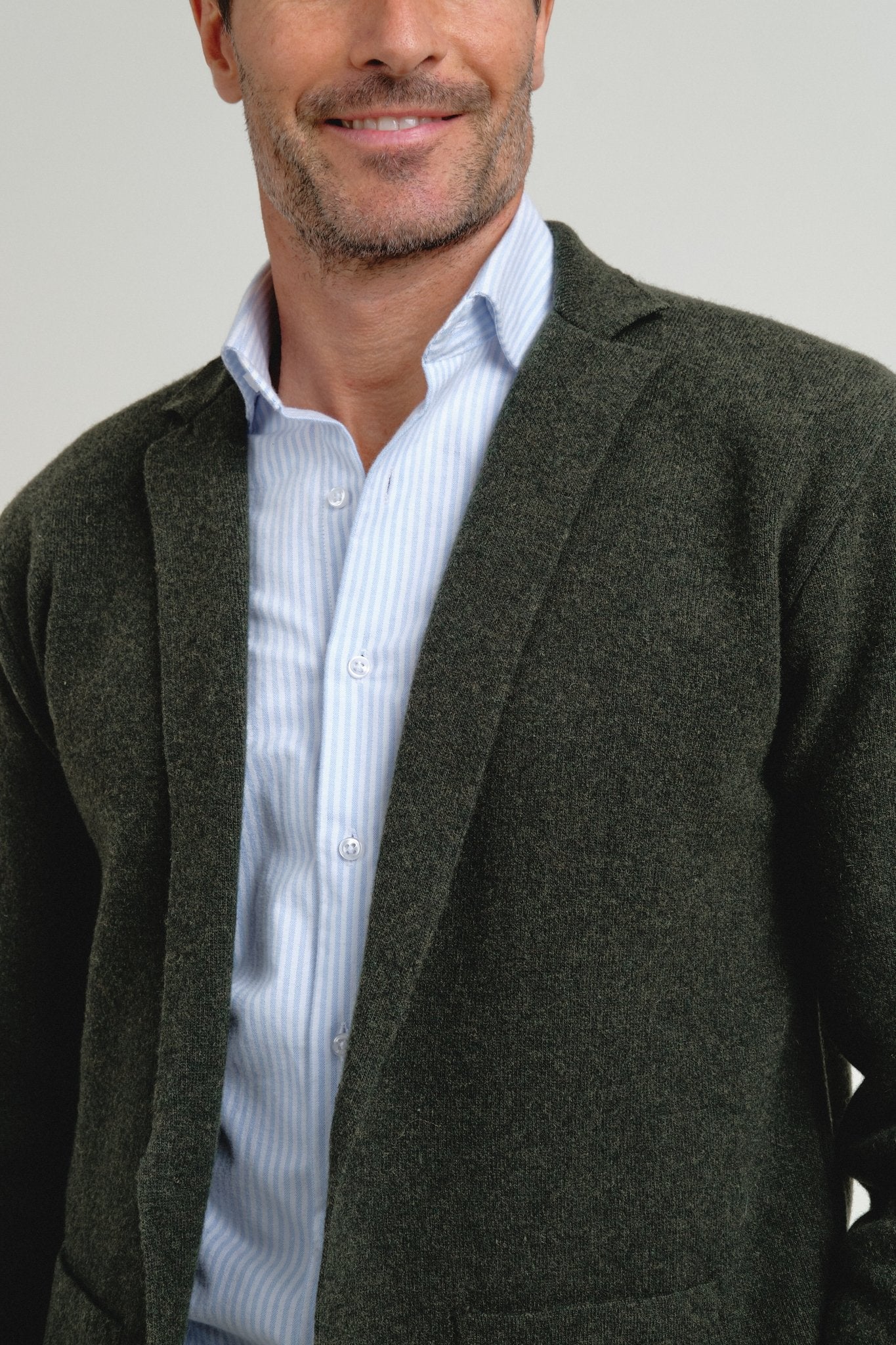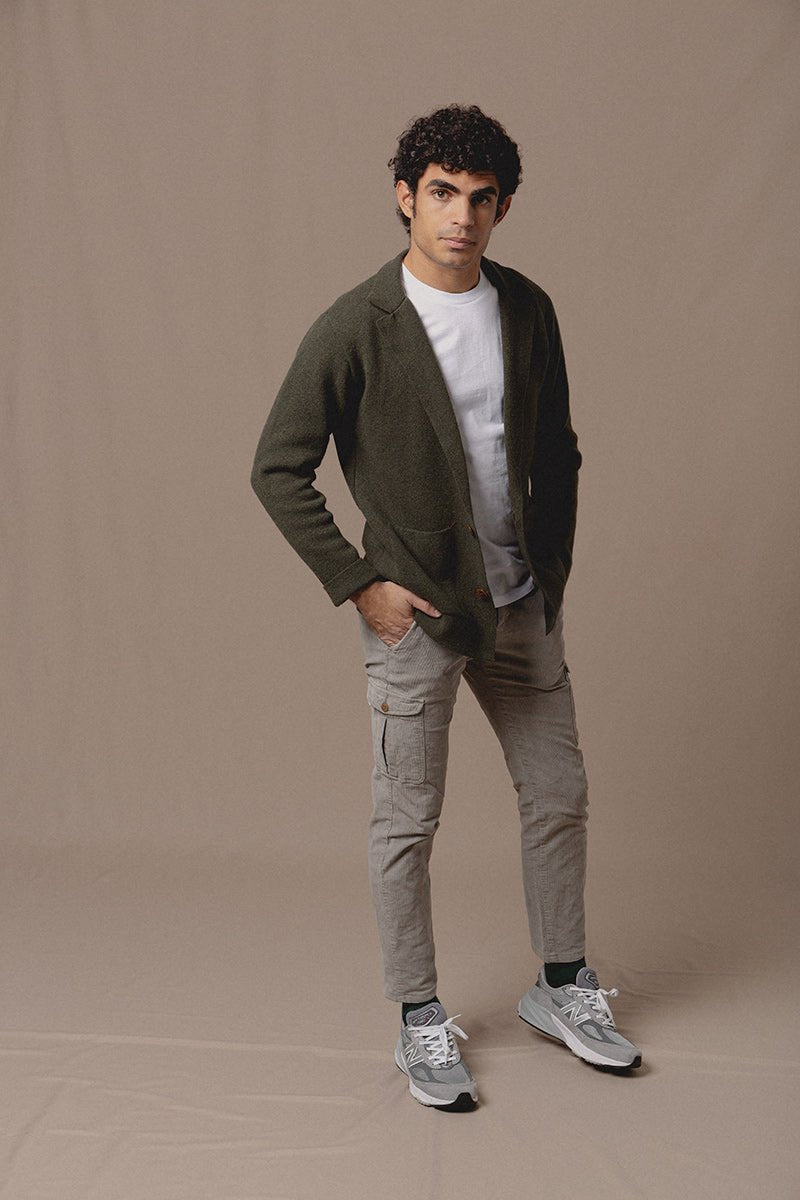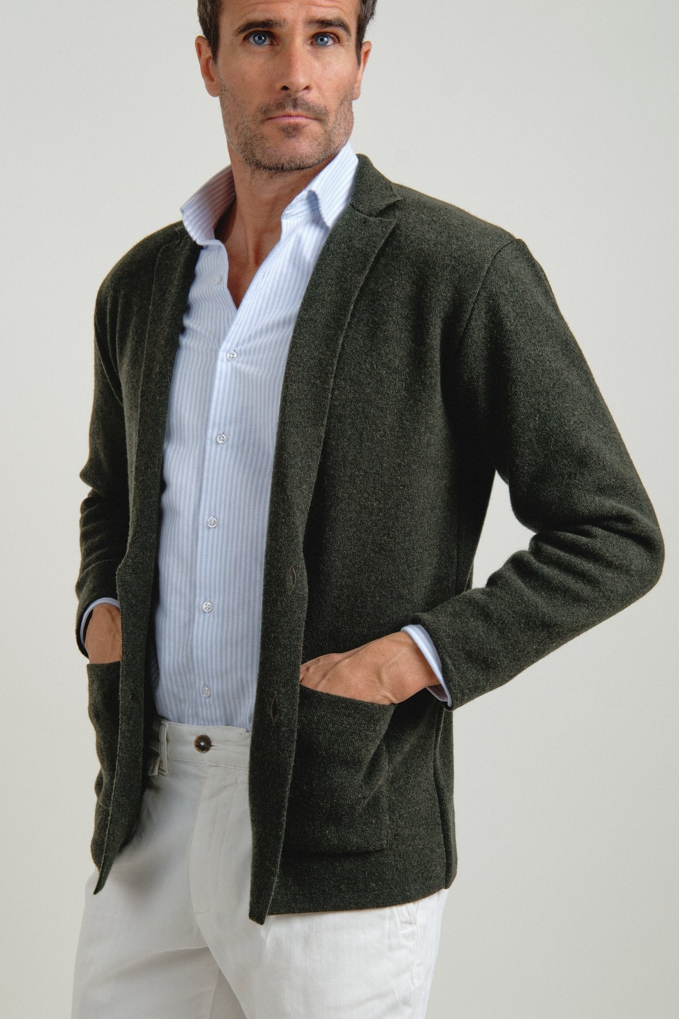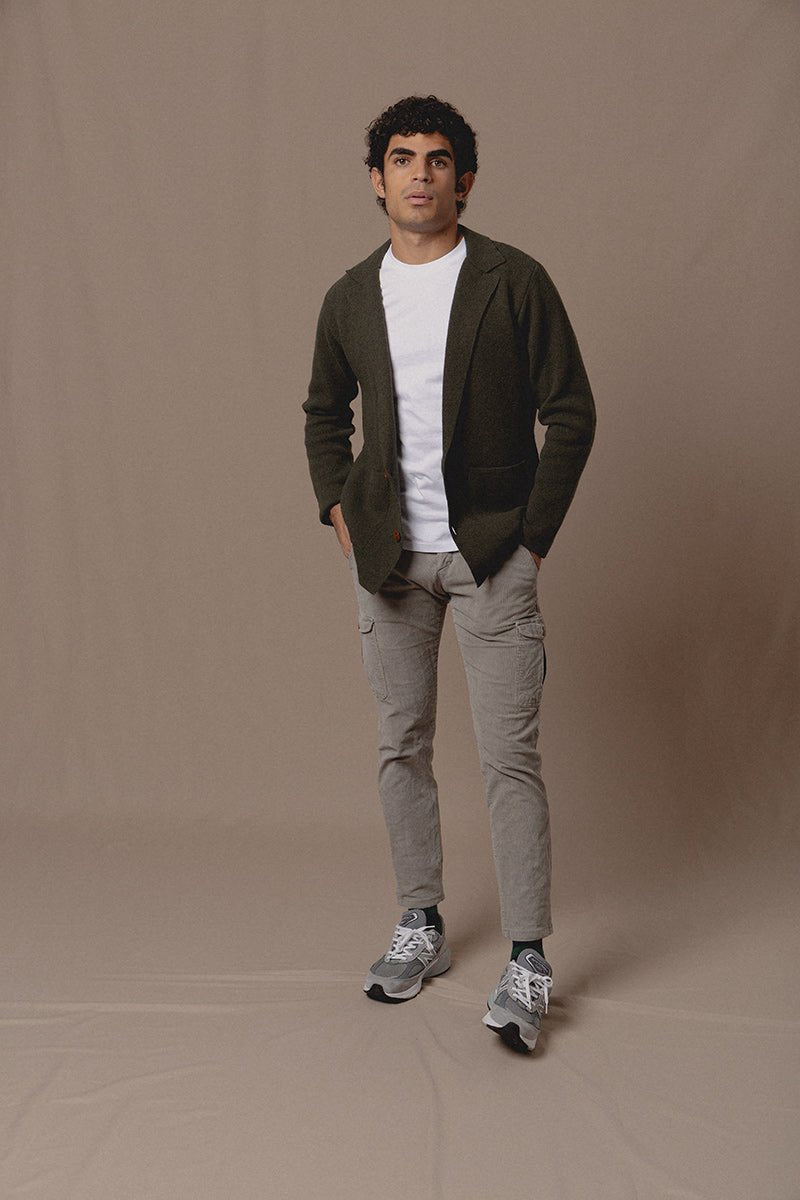 Los detalles de una chaqueta sastrera con la comodidad de un tejido de punto.