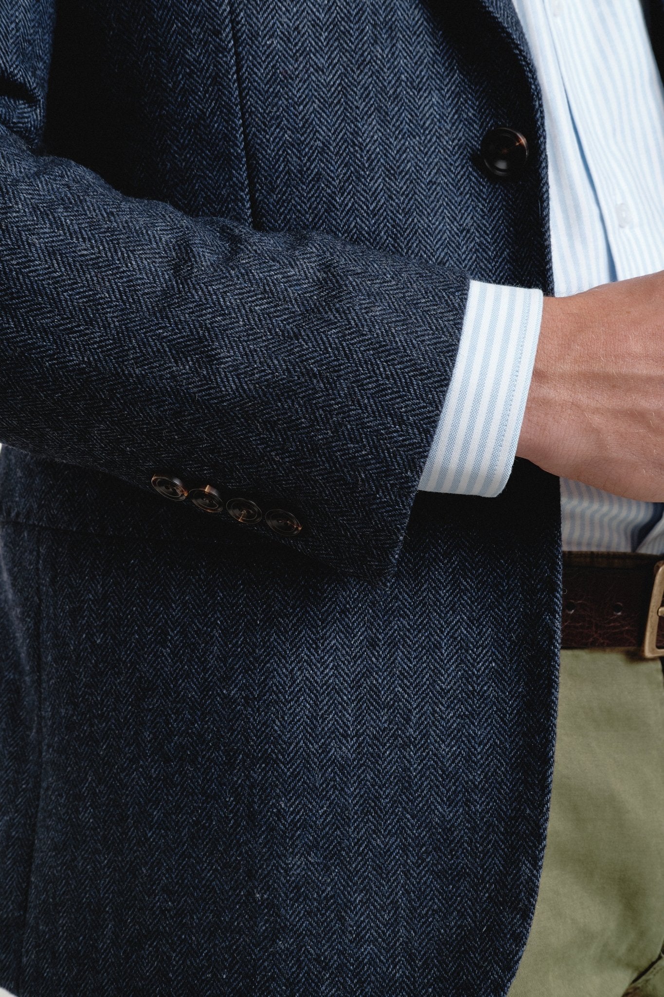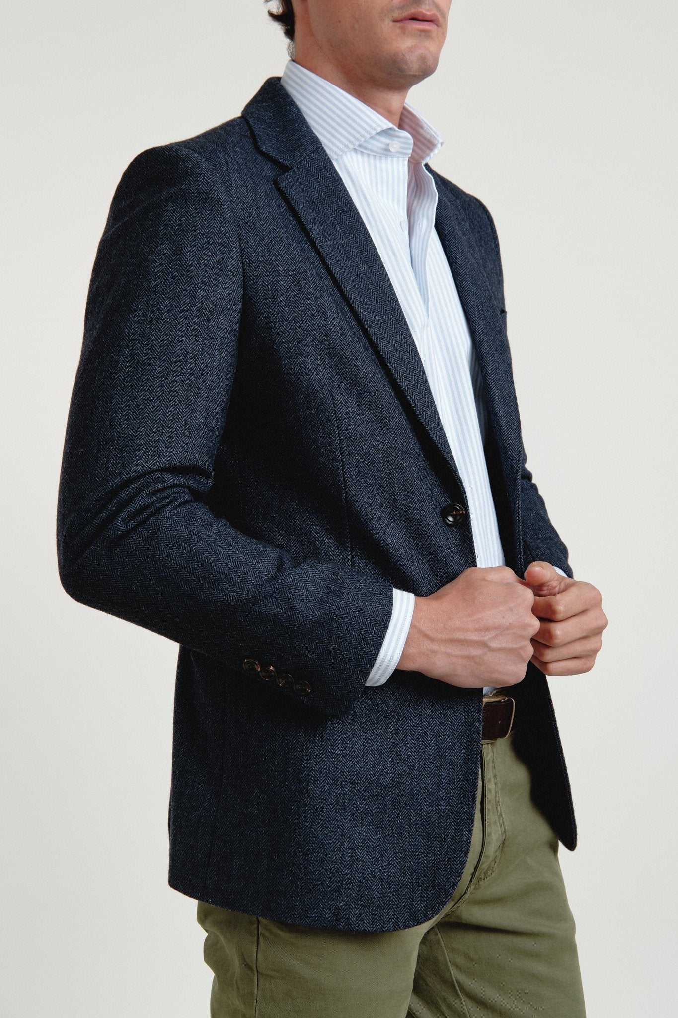 Esta americana de espiga de lana premium combina la calidez natural del tejido con un corte impecable que define la silueta con elegancia y seguridad. Su textura en espiga aporta profundidad y distinción, mientras que su confección muy cuidada garantiza una caída perfecta y un tacto suave al contacto.