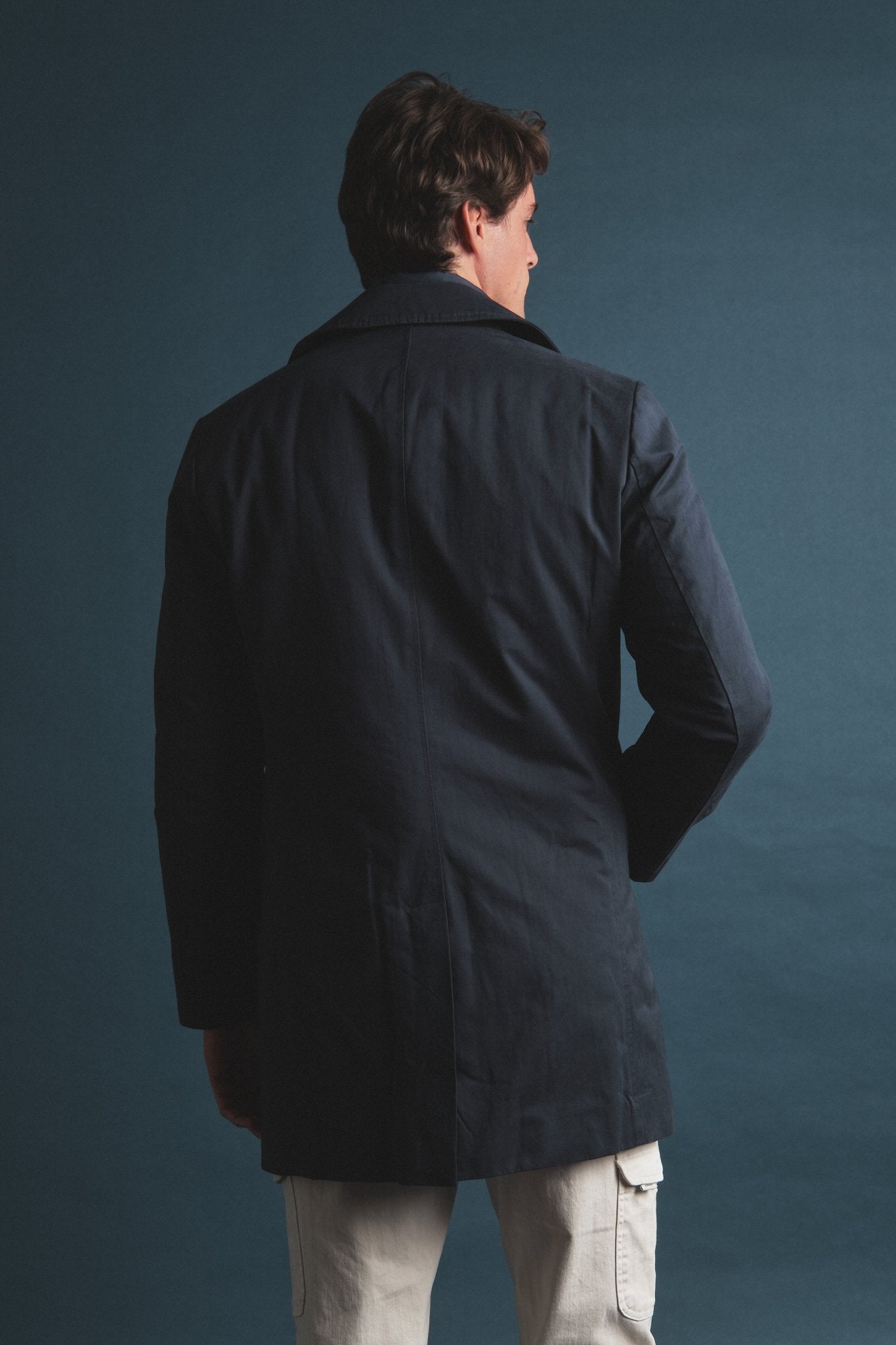 Dispone de dos bolsillos laterales insertados, ideales para mantener las manos resguardadas, y dos bolsillos interiores: uno con cierre de cremallera para mayor seguridad y otro con botón, pensado para tener a mano los objetos de uso frecuente. En la parte trasera, una abertura central en el bajo proporciona libertad de movimiento y un ajuste más cómodo.
